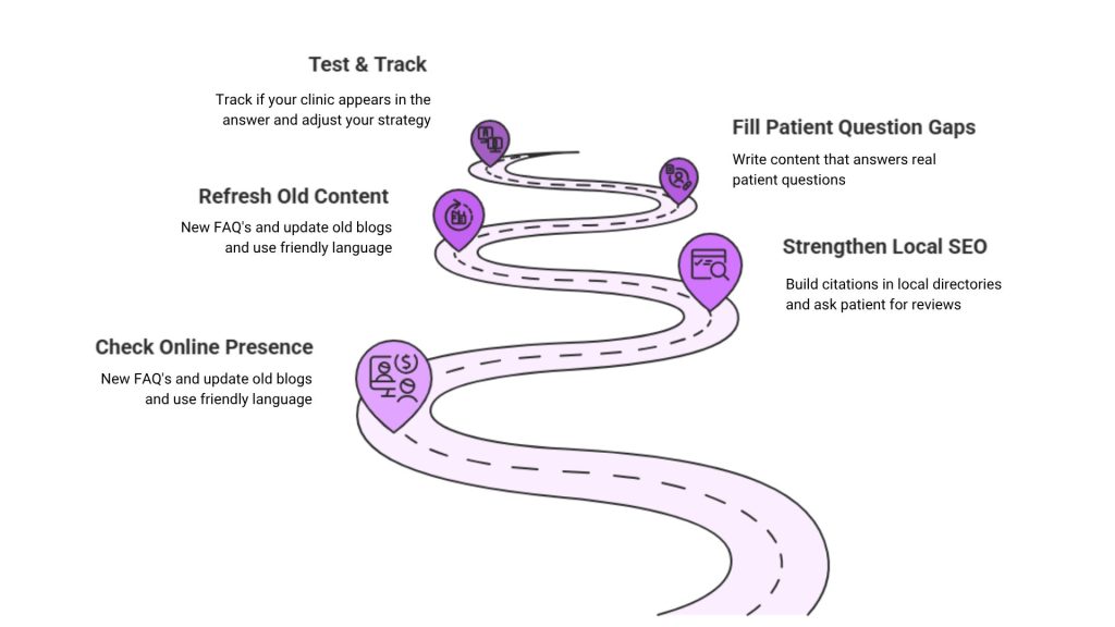 Start by updating your Google Business Profile, ensuring consistent contact details across the web, refreshing old content, and creating helpful blogs that answer common patient questions. Then, test your presence by asking AI tools where your clinic ranks in responses.